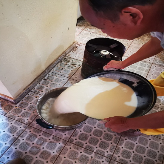 ? ? ? ? ? ? ? ? ? ? ? ? ? ? ? ? ? ? ? ? ? ? ? ? ?把煮好的豆浆,倒入已备好石膏的锅中(俗称:点豆腐)