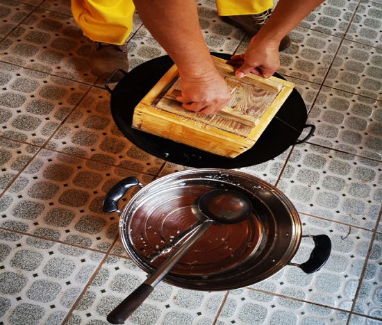 ? ? ? ? ? ? ? ? ? ? ? ? ? ? ? ? ? ? ?把点好的豆腐,倒入自制的木盒中压制成型